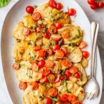 Overhead close-up of chicken scallopini in a large pan, generously topped with halved cherry tomatoes, whole capers, thinly sliced garlic, and fresh basil chiffonade.