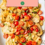 Close-up of golden-brown chicken scallopini on a white plate, topped with halved cherry tomatoes, capers, sliced garlic, and ribbons of fresh basil in a light butter sauce.