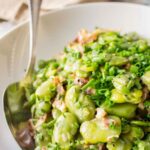 In this dish, the favas are paired with salty prosciutto and a splash of cream, creating a rich but balanced side that feels both rustic and elegant. A squeeze of lemon at the end brightens the whole plate.
