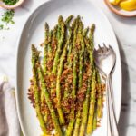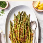 This roasted asparagus with parmesan breadcrumbs is everything you want in a spring side dish. The spears roast until tender and lightly caramelized, while the lemony, garlicky panko topping turns golden and crunchy on top. It's a quick, no-fuss recipe that's made on one sheet pan and is ready in under 25 minutes!